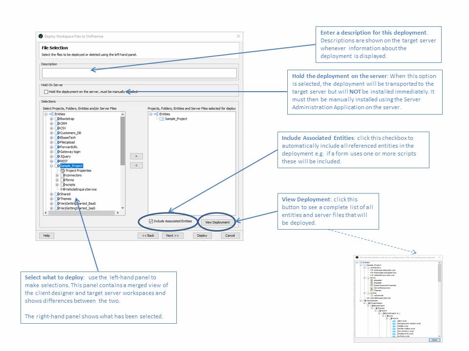 Click this button to see a complete list of entities and server configuration files to be deployed. This is useful when you have selected a project or one or more folders or when the Include Associated Entities option is selected. |