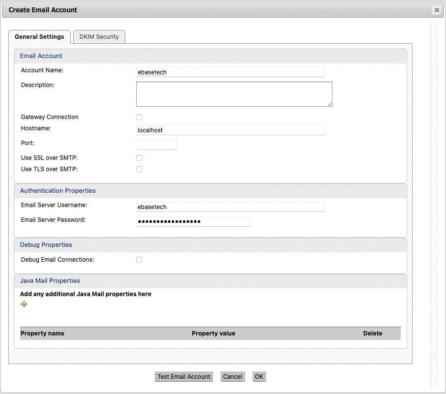 The properties that can be configured in the sections above are the email properties most commonly used, however any additional properties supported by the javamail API can also be configured by adding them in this section. The Verj.io email implementation always uses the SMTP protocol so only properties pertaining to this protocol will be effective.