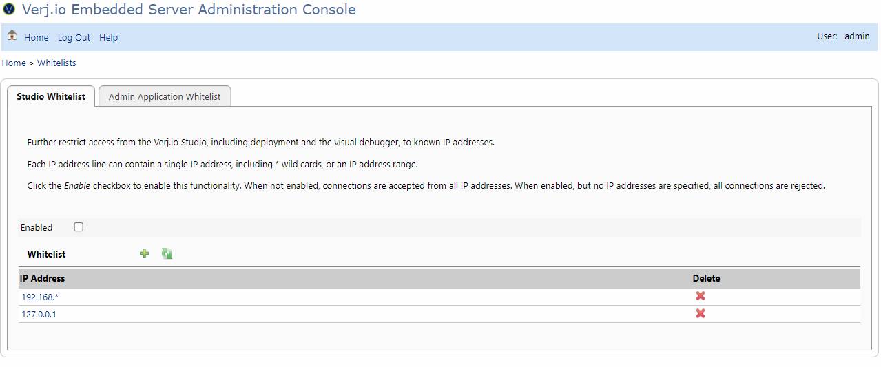 Select the tab for the white list you would like to configure. Filtering of IP addresses is only active when the Enabled checkbox is checked. Note that if Enabled is checked but no IP addresses are provided, access will be denied to all IP addresses.