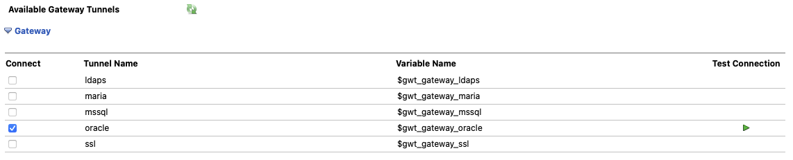 Check the Connect checkbox of the Gateway Tunnels you want to connect to. The connection to the Tunnel can be tested by clicking its Test Connection icon.